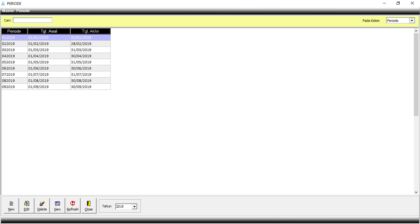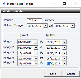 Tabel Master periode merupakan pedoman atau parameter yang digunakan untuk aplikasi untuk melakukan pengelompokkan dan pencatatan data yang di masukkan. Table ini di setup sesuai dengan kalender kerja yang berlaku, di bagi dalam periode, pekan dan hari kerja.