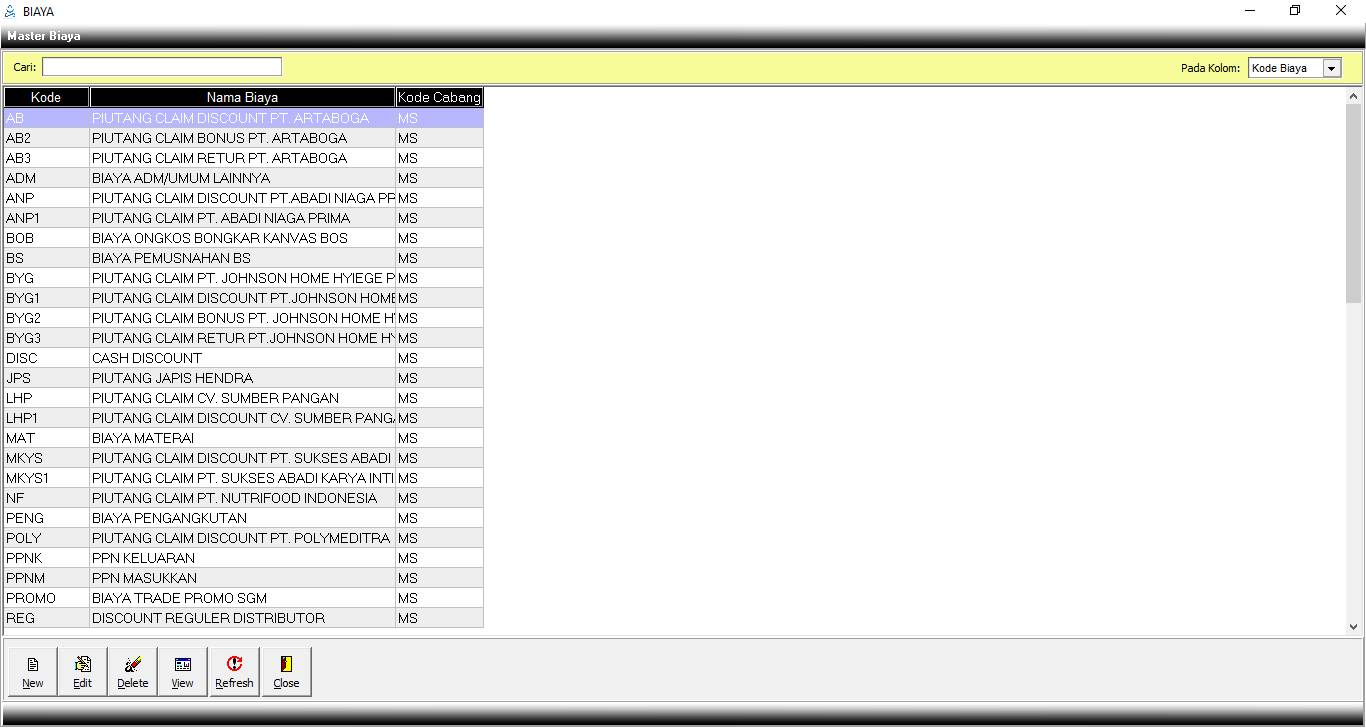 Biaya yang diinput dalam Master Biaya ini adalah biaya-biaya yang biasa dikeluarkan pada saat distributor melakukan pembayaran hutang atau pada saat customer melakukan pelunasan piutang, biaya ini juga nantinya digunakan untuk membuat nota kredit (sebagai pemotong piutang) maupun nota debet (sebagai pemotong hutang).