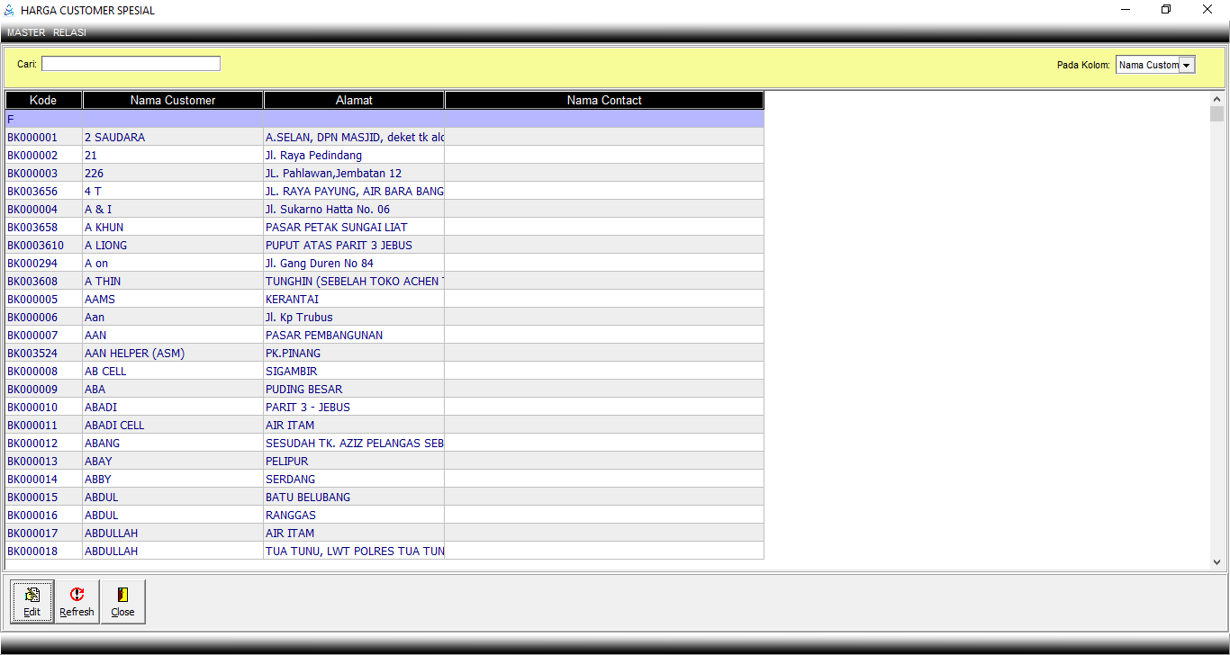 2. Maka akan muncul jendela Master Customer, pilih customer yang kelompok barangnya akan di tambahkan harga custommer up kemudian klik Edit.