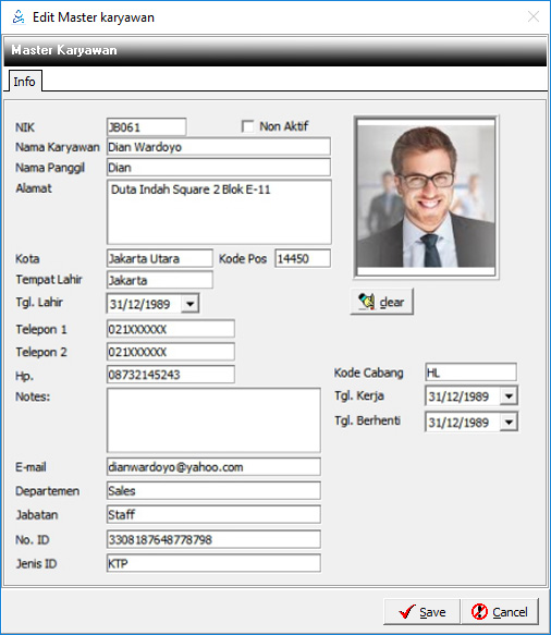 Tgl Berhenti Diisi tanggal karyawan mulai berhenti, apabila karyawan sudah tidak bekerja lagi sebaiknya master ini jangan dihapus. Lebih baik di non-aktifkan saja, agar data yang terkait dengan master ini tidak berantakan.