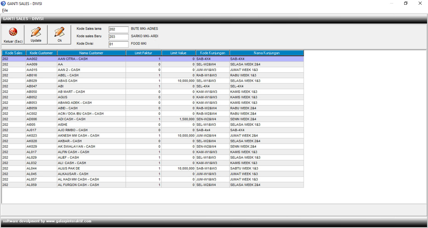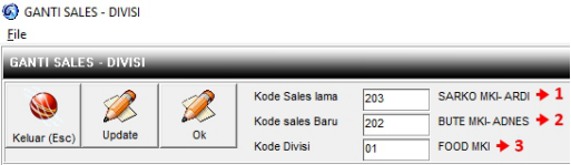 Sales lama keluar, digantikan dengan sales baru. Contoh sales 202 keluar, semua customer yang dipegang sales 202 dengan divisi 01 akan dipindahkan ke salesman 203.
