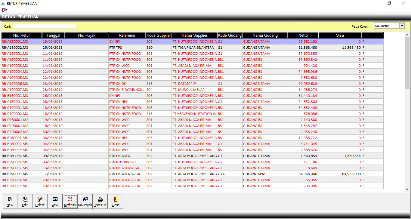 Retur pembelian merupakan pengembalian barang yang telah dibeli oleh distributor ke supplier, biasanya dikarenakan barang yang dibeli rusak/cacat/tidak sesuai dengan pesanan. Walaupun setelah menginput jumlah retur ini sudah mengurangi persediaan, namun belum mengurangi hutang karena belum dapat dipastikan apakah retur tersebut akan diganti dengan barang lagi ataukah diberikan dalam bentuk Nota Debet yakni untuk mengurangi total hutang ke supplier. Tanpa memotong hutang pembelian, jika belum di panggil di menu pembayarann hutang.