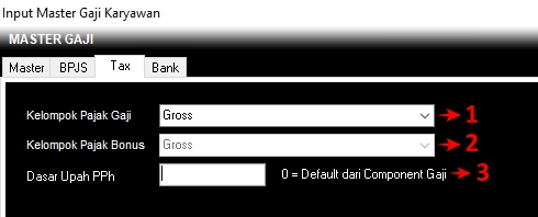 2 | Kelompok Pajak Bonus | Pilih metode perhitungan pajak bonus (Gross/ Net/ Gross Up) |
