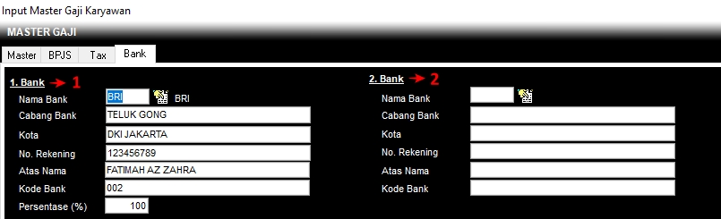 1 | Bank Utama | Diisi data rekening utama baik cabang bank, no.rekening bank, atas nama buku bank dan presentase. Jika gaji akan ditransfer ke satu rekening saja maka isikan 100. Jika gaji akan di transfer ke 2 rekening, maka presentase pada rekening utama diisi contoh 85 dan secara otomatis sisanya 15 akan masuk rekening bank lainnya |