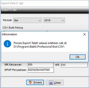 3. Klik Proses untuk mencetak data Export Data E-SPT, tunggu hingga proses selesai. Jika proses selesai maka akan tampil jendela bahwa proses selesai. Klik OK untuk menutupnya.