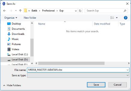 2. Maka muncul jendela untuk menyimpan file export, pilih folder kemudian isi nama file dan extention file kemudian klik Save untuk menyimpan.
