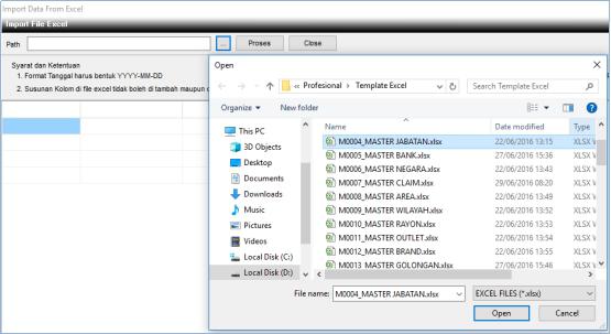 3. Maka muncul jendela Import File Excel,  pilih  Elipsis  untuk mengambil file yang akan diimport dengan nama file M0004_MASTER JABATAN.xls (harus ada di folder Template Excel).